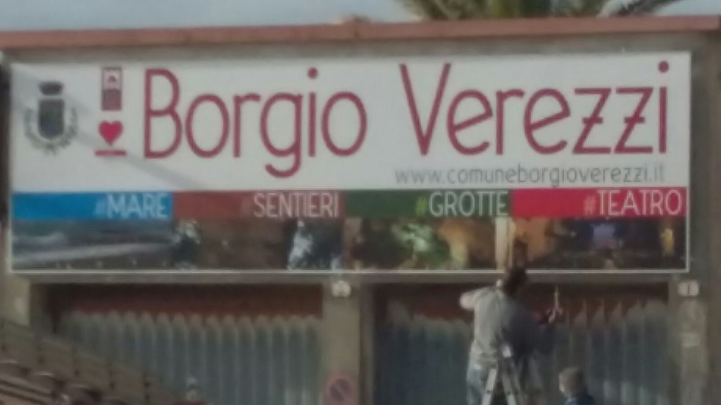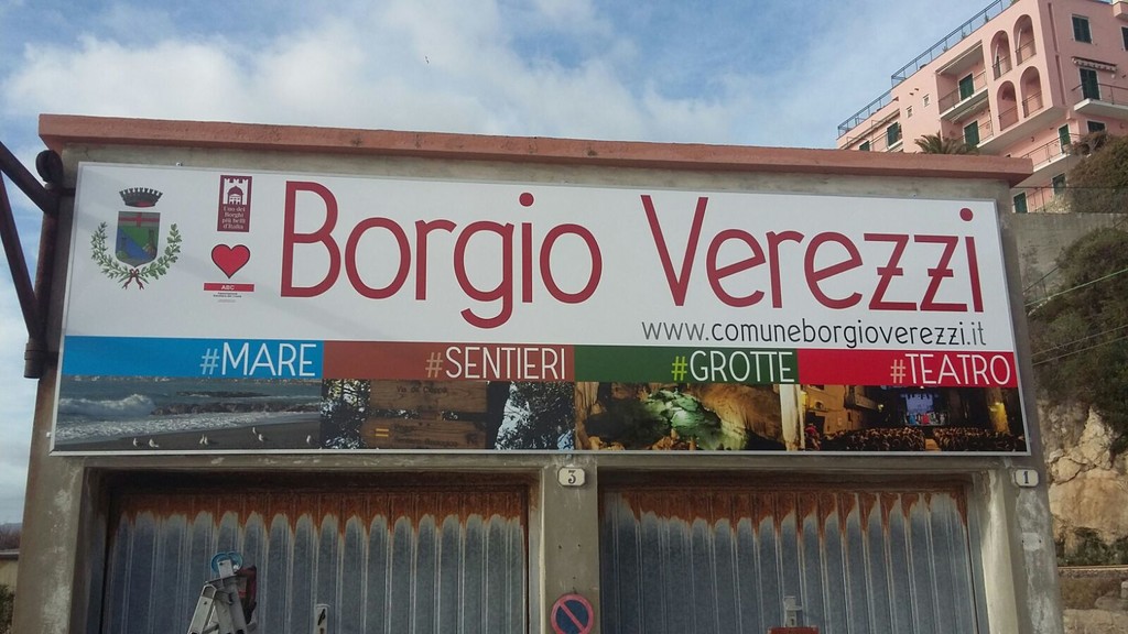 Questa mattina è "apparso" sulla via Aurelia, all'ingresso di Borgio Verezzi arrivando da Finale Ligure, un cartello da 5,40 metri circa di lunghezza per 1,60 di altezza nel quale vengono promosse le bellezze cittadine: sentieri, teatro, grotte e mare. A breve un cartello analogo verrà messo all'entrata cittadina da ponente, per fare il paio con quello a levante.