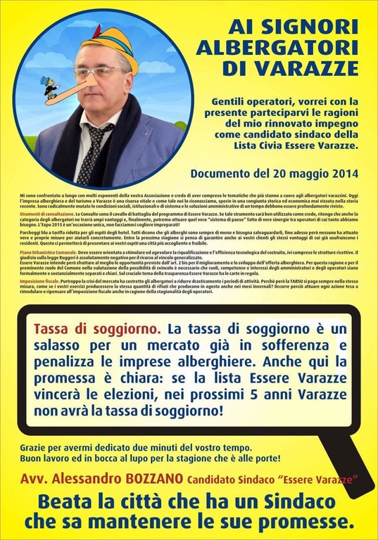 Il primo ricorda tutti i punti della lista “Essere Varazze” e naturalmente quello sulla tassa di soggiorno: “La tassa di soggiorno è un salasso per un mercato già in sofferenza e penalizza il settore alberghiero. Se la lista “Essere Varazze” vincerà le elezioni nei prossimi cinque anni a Varazze non ci sarà la tassa di soggiorno” recita il programma.