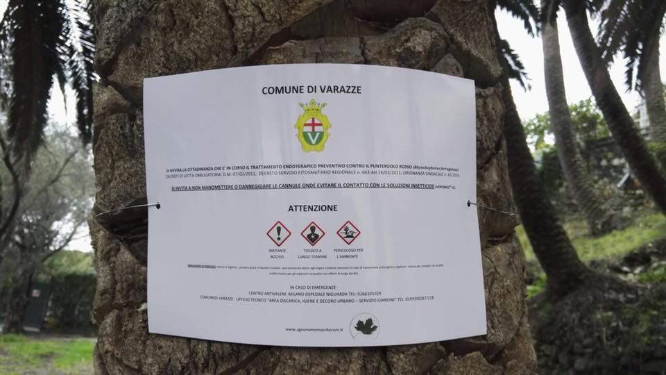 "Come preannunciato, abbiamo iniziato il trattamento preventivo sulle prime 50 palme Phoenix Canariensis del territorio comunale con la speranza di preservarle dall'aggressione del punteruolo rosso che come sappiamo sta decimando il nostro patrimonio palmifero. Con l'intervento di oggi (martedi 30 gennaio) si e' iniziato a trattare uno dei siti più importanti e significativi del nostro territorio ovvero la Baia del Corvo in lungomare Europa" commenta sulla propria pagina Facebook il sindaco di Varazze Alessandro Bozzano.