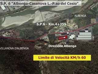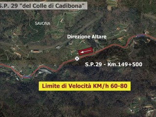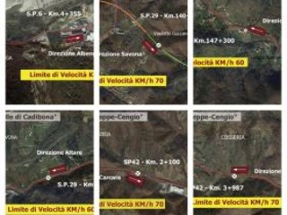 In particolare sulla S.P.29 “del Colle del Cadibona” saranno attivi gli autovelox al Km. 149+500 in Località Maschio in direzione Altare (limite di velocità autoveicoli 80 Km/h moto 60 Km/h) al 147+300 in Località Montemoro sempre in direzione Altare (limite di velocità 60 Km/h). Sulla S.P.29 “del Colle del Cadibona” al Km. 140+600 presso il Viadotto Gazzana in direzione Savona (limite di velocità 70 Km/h) e sulla S.P.42 “San Giuseppe - Cengio” al Km. 2+100 in direzione Carcare (limite di velocità 70 Km/h ) e al Km. 3+987 in direzione Cengio (limite di velocità 70 Km/h). Sulla S.P.6 “Casanova Lerrone – Passo del Cesio” al Km. 4+355 – Direzione Albenga (Limite di velocità 60 Km/h).
