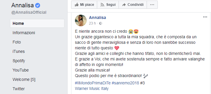 "Questo podio per me è straordinario!". Cosi Annalisa Scarrone ha commentato sulla propria pagina Facebook il risultato ottenuto alla 68^ edizione del Festival di Sanremo con la sua "Il mondo prima di te".