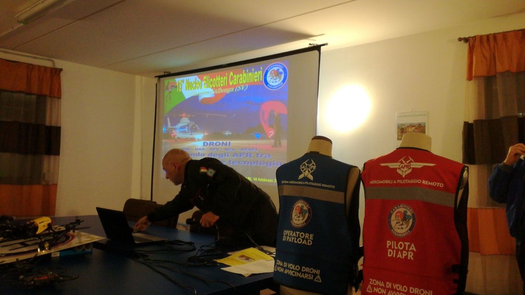 La conferenza è stata tenuta dal Maggiore Claudio Proietti, comandante del 15° Nucleo Elicotteri Carabinieri di Villanova d'Albenga e dal comandante pilota di APR Andrea Losi.