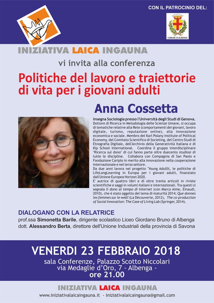 Venerdì 23 febbraio alle ore 21 presso Palazzo Scotto Niccolari (via Medaglie d'Oro 7, in Albenga) si terrà la seconda conferenza organizzata da Iniziativa Laica Ingauna, dopo l'ottimo riscontro ottenuto dall'incontro col Prof. Vittorio Lingiardi “Si nasce o si diventa”. La sociologa Anna Cossetta affronterà il tema “Politiche del lavoro e traiettorie di vita per giovani adulti”. Si tratta di un argomento quanto mai attuale, alla luce dei mutamenti che la società sta avendo in campo tecnologico,  e alla crisi del mercato del lavoro.