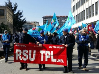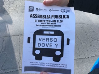 Più di 100 persone tra lavoratori, rsu e sindacati (Cgil, Cisl, Uil e Faisa) si sono ritrovati sotto la sede della Provincia a Savona per scioperare contro la privatizzazione del Trasporto Pubblico Locale.