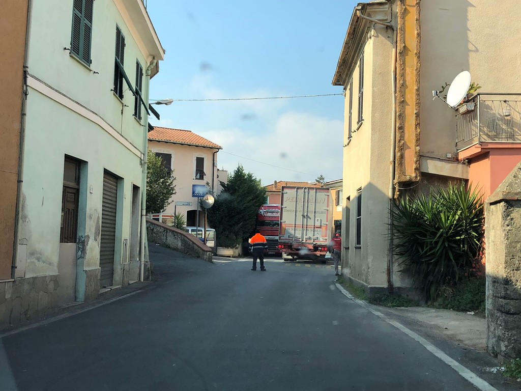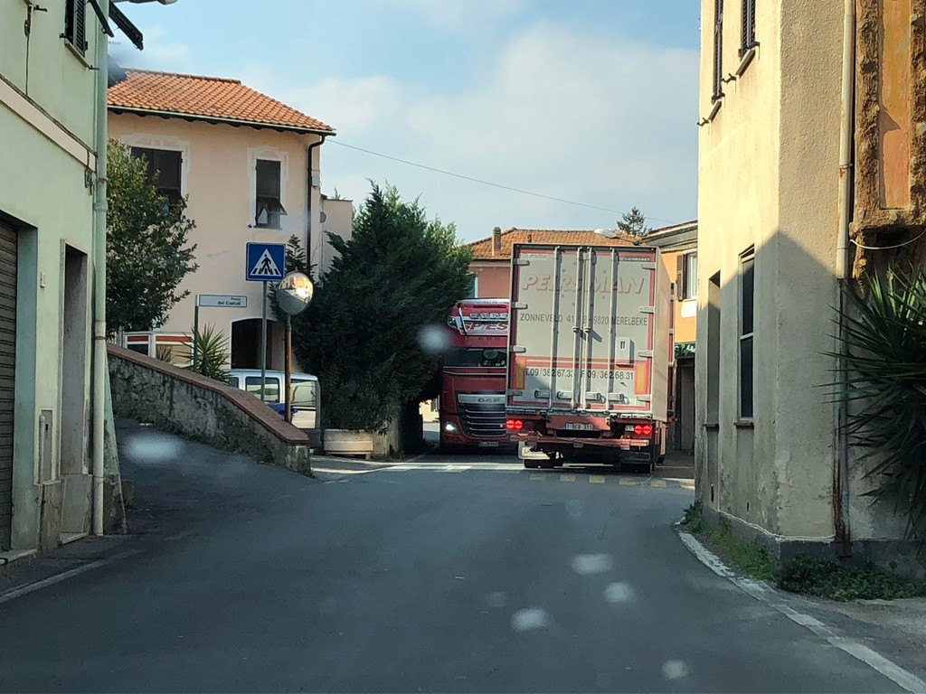 Strade strette e due camion si "incastrano" a San Fedele d'Albenga. L'episodio si è verificato intorno alle 12.30 e solo dopo diverso tempo si è riusciti a sbloccare la situazione ed il traffico ha potuto riprendere a scorrere regolarmente.