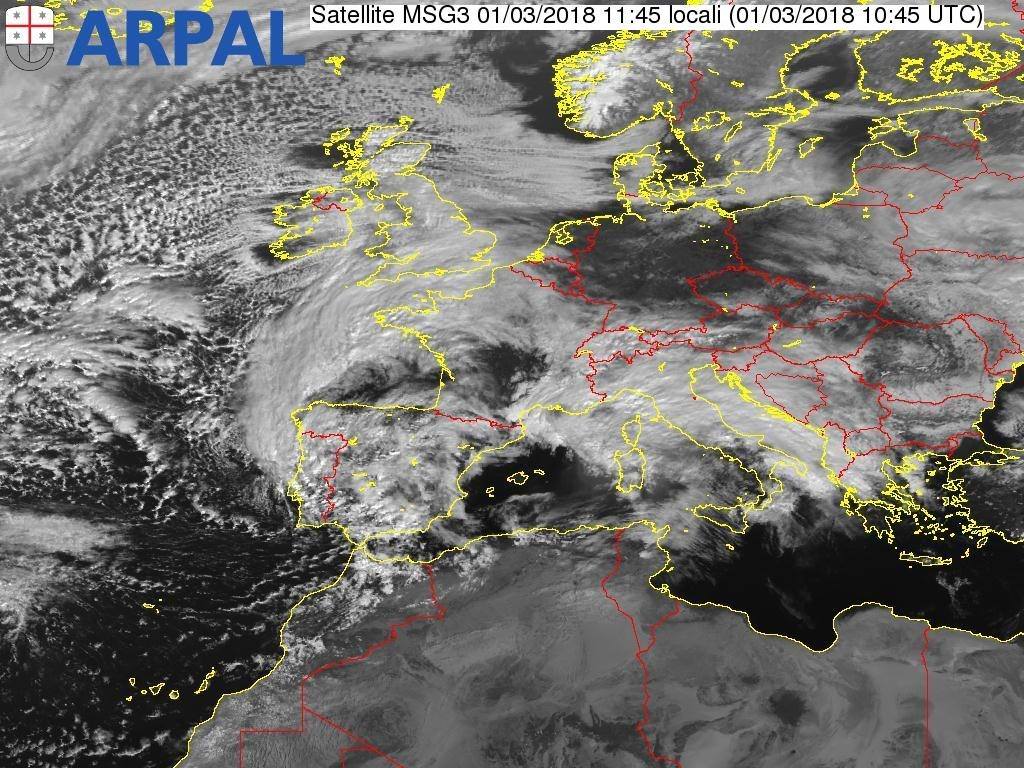 In allegato: la cartina con le zone di allertamento, la tabella con la scansione oraria dell'allerta e l'immagine del satellite sul Mediterraneo alle ore 11.45