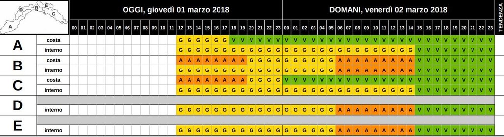 ZONA C: COMUNI COSTIERI arancione fino alle 20 di oggi, giovedì 1 marzo; gialla fino alle 23.59 sempre di oggi;