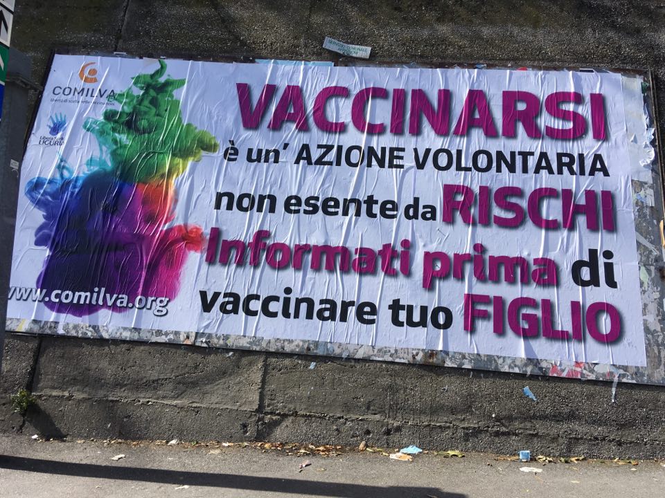A due giorni dalla scadenza del termine per la presentazione alle segreterie scolastiche del certificato di vaccinazione, a Savona in via vittime di Brescia, è stato affisso, nella zona del servizio comunale, un cartellone della Comilva (coordinamento del movimento italiano per la libertà delle vaccinazioni) il quale recita: “Vaccinarsi è un’azione volontaria non esente da rischi. Informati prima di vaccinare tuo figlio”.