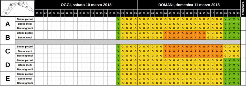 ZONA C (tutti i bacini): ALLERTA GIALLA DALLE 20 DI OGGI, SABATO 10 ALLE 5.59 DI DOMANI DOMENICA 11. POI ARANCIONE DALLE 6 ALLE 20 E NUOVAMENTE GIALLA FINO ALLE 23.59 SEMPRE DI DOMANI, DOMENICA 11;