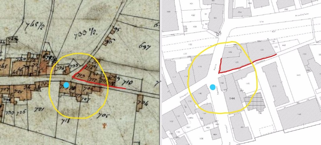 (Nella foto allegata è visibile il raffronto tra la carta napoleonica del 1813 di Laurent Bergalli e l’attuale catasto. E’ di tutta evidenza l’edificio successivamente demolito per la realizzazione dell’attuale Via Drione e di cui sono state trovate le fondazioni nei lavori di scavo)".