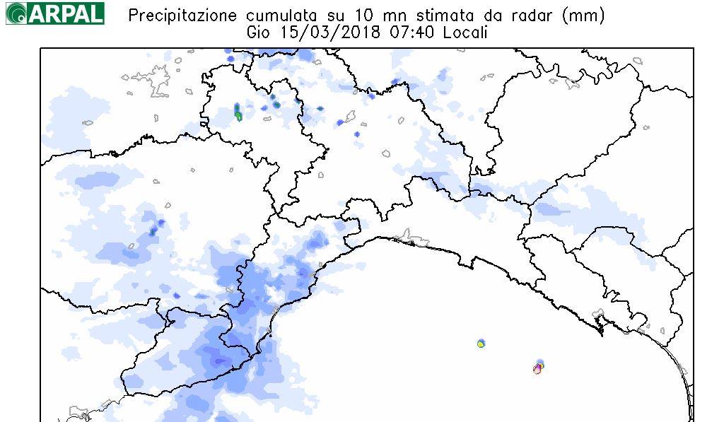 Aggiornamento ore 8: per il momento le precipitazioni, deboli, hanno interessato il Ponente della regione con cumulata massima, nelle ultime 6 ore, a Stella Santa Giustina (Savona) con 15.8 millimetri (e cumulata oraria massima di 10.4 millimetri)