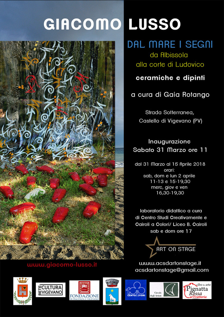 L'Associazione Culturale Art on Stage presenta la mostra del maestro Giacomo Lusso “Dal mare i segni – da Albissola alla corte di Ludovico” curata da Gaia Rotango, che aprirà al pubblico dal 31 marzo al 15 aprile 2018 presso la Strada Sotterranea del Castello di Vigevano. Nel percorso sono raccolte opere pittoriche e sculture in ceramica che ripercorrono la vicenda artistica di Lusso. I segni, centro della poetica dell'artista, sono una costante iconica dal senso spirituale e catartico. Hanno una funzione dinamica, giungono muti dal mare della costa ligure, da Albissola Marina, noto paese di artisti dove Lusso vive e lavora, al Castello di Ludovico il Moro, come se fosse stato scelto quale mecenate.