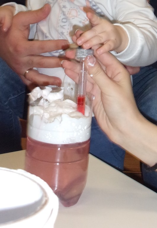 Un altro esperimento chiamato “acchiappa la bolla” ha fatto scoprire la “magia” della trasformazione di palline di gel per vasi, inserite in una vaschetta trasparente a cui è stata aggiunta dell’acqua, che ha permesso di far “scomparire” alla vista le stesse palline, ritrovate poi dai bambini inserendo la manina nella vaschetta. Invece con l’esperimento “scappa via” i bambini si sono divertiti facendo “scappare i colori” attraverso le proprie dita immerse prima nel sapone liquido per piatti e poi nella pozione fatta da latte e colori liquidi mischiati in giuste dosi.