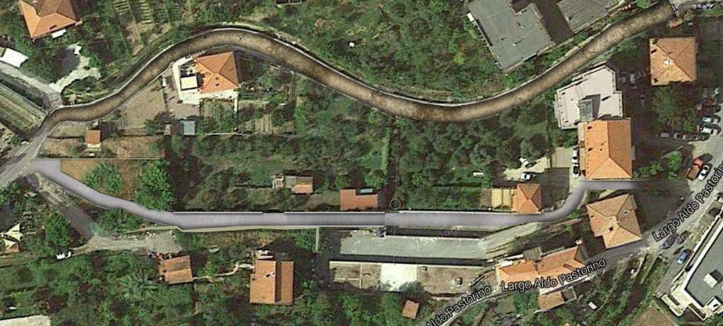 Il nuovo tracciato prevede l'utilizzo dell'imbocco esistente su Largo Pastorino attualmente utilizzato per l'accesso a una serie di box privati, la realizzazione di una rampa carrabile di raccordo delle quote e il proseguimento della strada fino al raccordo con la viabilità esistente. E' evidente il beneficio per la sicurezza derivante dall'interdizione al traffico all'interno di un alveo fluviale.