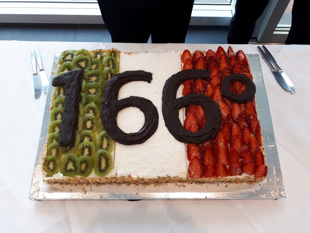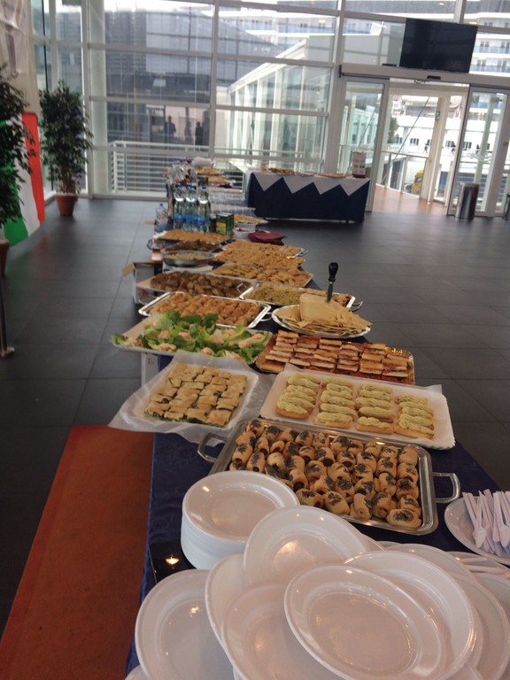 Il menù organizzato dal “Migliorini” di Finale Ligure per il rinfresco comprendeva: piccole tire della Val Bormida (si tratta di una sorta di pagnottino di patate cotto al forno con la salsiccia al suo interno), tortini verdi assortiti, pizze e focacce, salatini vari, cocktail di gamberetti, il tradizionalissimo stoccafisso alla “brandacujun”, polpo e panizza, pasticceria salata di formaggi, grana e pane carasau, salumi e cima forniti dal salumificio finalese Chiesa e gran finale con un dolce solenne: la “torta del 166°”, una base di pan di spagna con crema al cocco, frutta fresca e bagna analcolica decorata con la frutta che formava il nostro Tricolore e il numero 166.