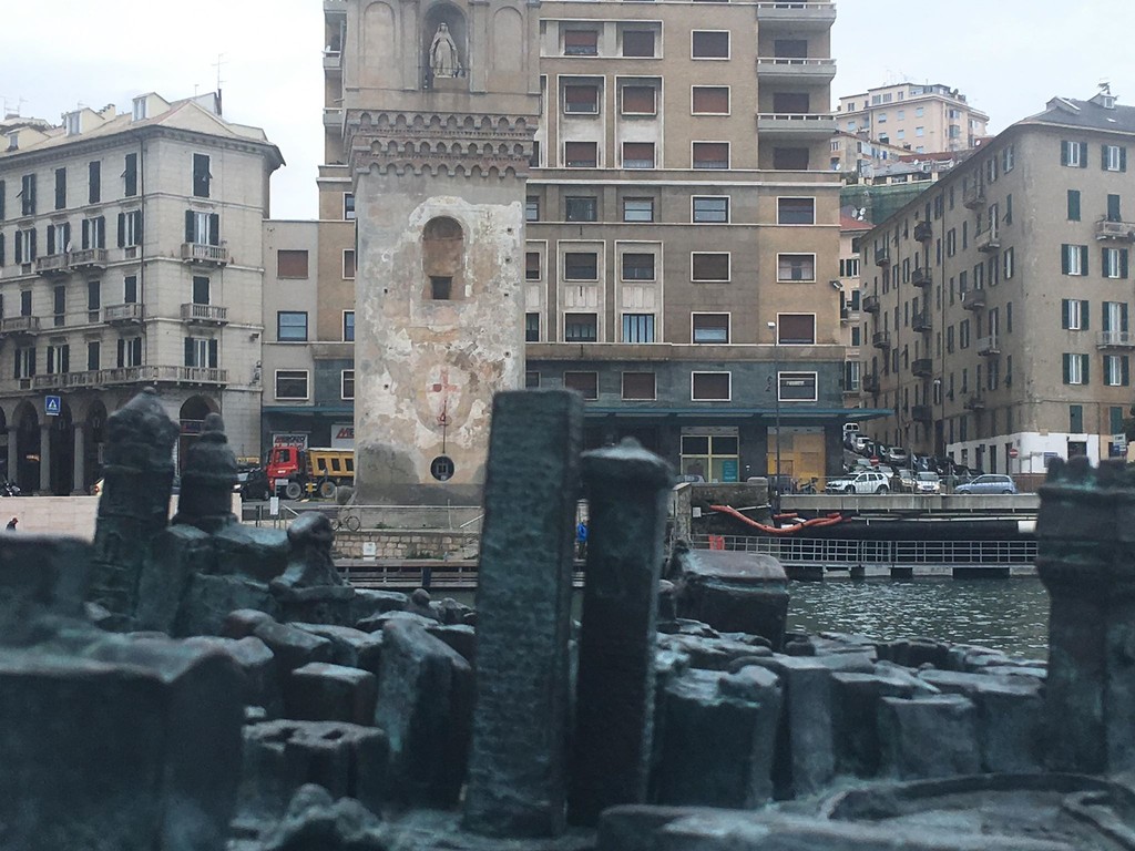 Nulla da temere, la piazza del Brandale è sempre sovrastata dalle tre leggendarie torri ma nella scultura in bronzo creata nella Darsena di fronte alla Torretta a favore dei non vedenti con scritte in braille per riconoscere la città (ma non solo, utile anche ai croceristi), qualcosa non quadra.