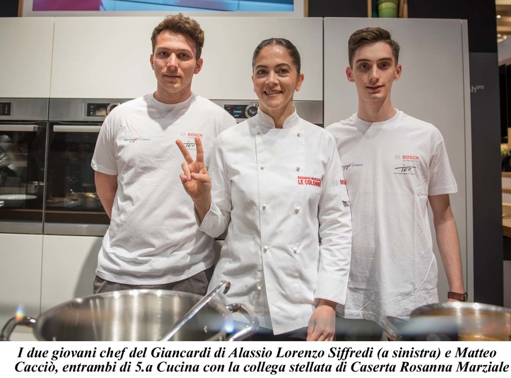 Nella mattinata di sabato 21 aprile dodici ragazzi selezionati dagli Istituti Alberghieri coinvolti nel progetto #tuttiaifornelli, trai i quali Matteo Cacciò e Lorenzo Siffredi dell’Istituto Giancardi di Alassio, hanno avuto l’opportunità di vivere una più che unica esperienza di alternanza scuola-lavoro, partecipando alla prestigiosa Fiera EuroCucina, parte del Salone del Mobile di Milano, evento internazionale di riferimento per il settore degli elettrodomestici.