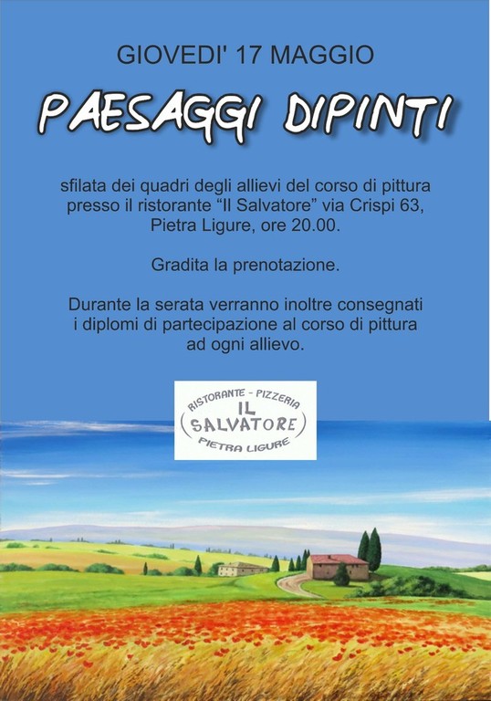 - GIOVEDI’ 17 MAGGIO: “PAESAGGI DIPINTI” sfilata dei quadri degli allievi del corso di pittura presso il ristorante “Il Salvatore” via Crispi 63, Pietra Ligure, ore 20.00.