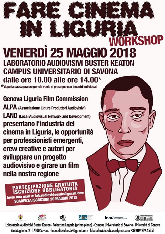 Il giorno Venerdì 25 Maggio 2018, presso il Laboratorio Audiovisivi Buster Keaton, nel Campus universitario di Savona, Palazzina Lagorio, primo piano, si terrà dalle ore 10.00 alle ore 14.00, con possibilità di incontri individuali dopo pranzo, il workshop dal titolo "Fare cinema in Liguria".
