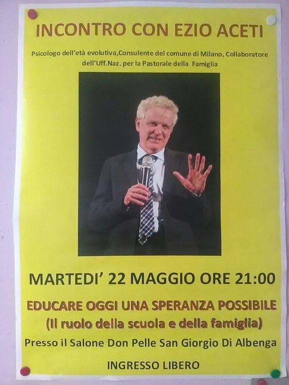 Ezio Aceti, il noto psicologo dell’età evolutiva e mediatore familiare sarà il protagonista dell'incontro dal titolo “Educare oggi, una speranza possibile” che si terrà martedì 22 maggio alle 21 nel salone Don Pelle di San Giorgio di Albenga. La serata, organizzata dall’asilo parrocchiale è rivolta in particolare ai genitori con figli e agli educatori e l’ingresso è libero.