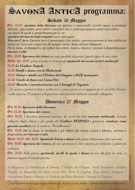 Un viaggio nell'antico, immersi nel Medioevo, Savona e la Darsena domani, 26 maggio e domenica 27, faranno un tuffo nel passato e si vestiranno di storia grazie all'evento "Savona Antica".