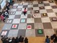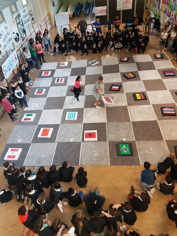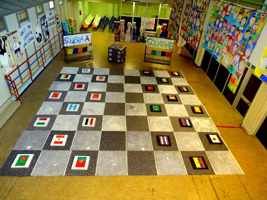 Per educazione interculturale, le pedine di molti Paesi del mondo hanno disputato il partitone su una scacchiera di otto metri per otto; sessantaquattro metri quadrati di gioco mai visti e una partita col dadone di un metro cubo che si può girare solo in tre.