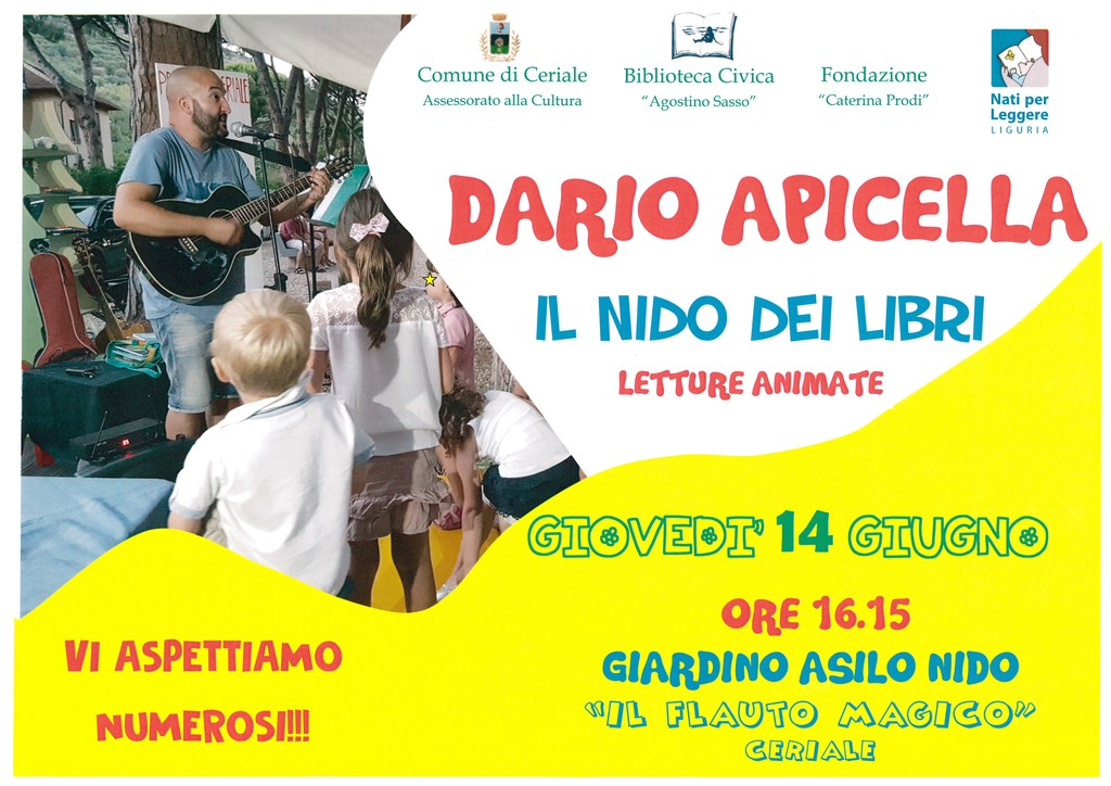 Oggi pomeriggio alle 16.15, presso il giardino dell’Asilo Nido “Il Flauto Magico” di Ceriale (Via Roma) sarà presente lo scrittore e animatore per bambini Dario Apicella per far divertire grandi e piccini con le sue fantastiche storie!