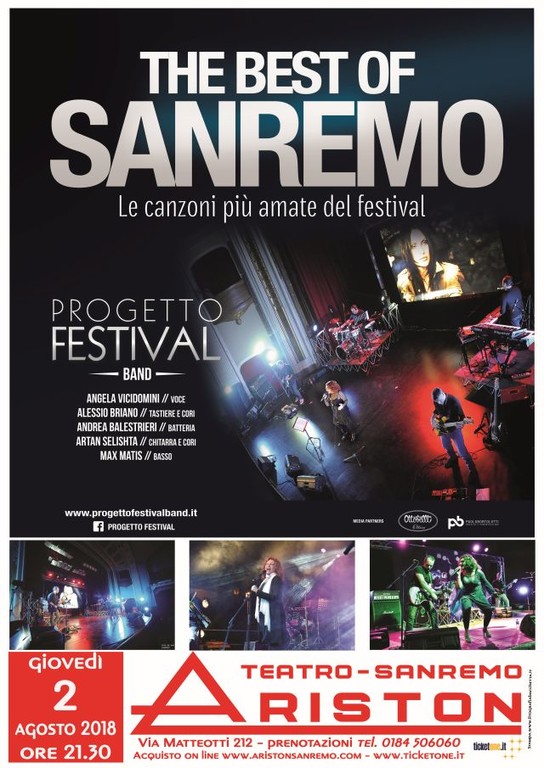 Ormai è diventata una tradizione che nelle ultime settimane di giugno, contestualmente con l’arrivo dell’estate e con la Giornata Internazionale della Musica (che per tradizione cade proprio il 21) i Progetto Festival facciano partire la “grande macchina” del loro tour estivo. E naturalmente, per chi suona i classici di Sanremo, il sogno più grande è quello di esibirsi al Teatro Ariston: e Progetto Festival ha coronato anche questo importante traguardo! La band salirà sul palco del teatro sanremese il 2 agosto in un concerto che regalerà emozioni, coinvolgimento e spettacolo ad altissimo livello.