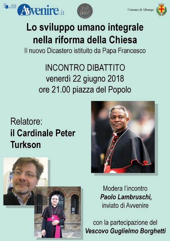 "Lo sviluppo umano integrale nella riforma della Chiesa, il nuovo Dicastero istituto da Papà Francesco". È questo il titolo dell'incontro dibattito che si svolgerà venerdì 22 giugno alle ore 21 in piazza del Popolo ad Albenga.