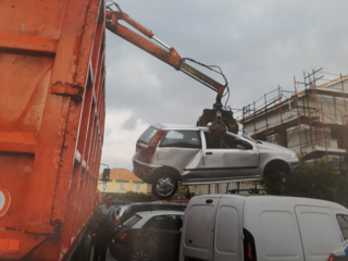 Lotta contro il degrado, la polizia locale di Albenga rimuove e demolisce veicoli abbandonati (FOTO e VIDEO)