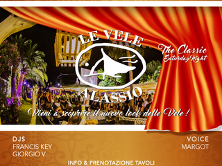 Le Vele Alassio - The Classic Saturday Night, ed il titolo dice tutto: il leggendario sabato notte della Riviera ligure di Ponente firmato Le Vele Alassio! L'ingresso è in omaggio per le donne entro le ore 00:00 e ridotto tutta la notte per i possessori della Resident Card. Arrivate presto, fate festa insieme a noi e aspettiamo l'alba insieme!