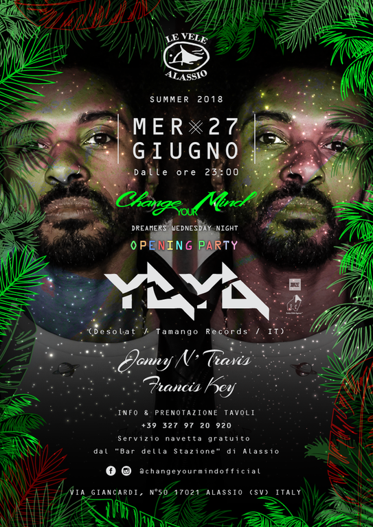 Le Vele Alassio presenta Change Your Mind, serata dedicata alla musica elettronica con ospiti di fama internazionale. Questo mercoledì special guest dj: Yaya. Resident djs: Jonny N' Travis e Francis Key. Per l'occasione I'ingresso sarà in omaggio per le donne e ridotto per gli uomini entro le ore 00:30! Vi aspettiamo! https://www.facebook.com