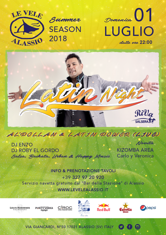 Le Vele Alassio - Latin Night by Riva Salsera, il grande ritorno a Le Vele Alassio della serata dedicata agli amanti dei balli latino-americani. Questa domenica siamo lieti di presentare Al'Pollan & Latin Power (Live). Vi aspettiamo!