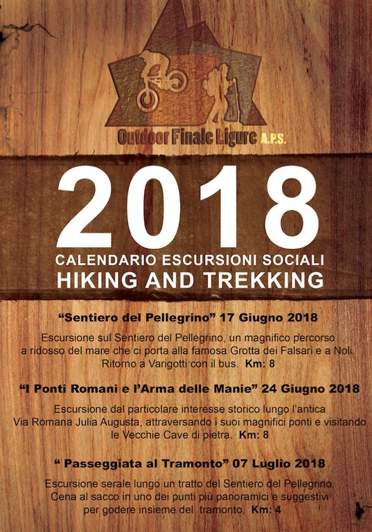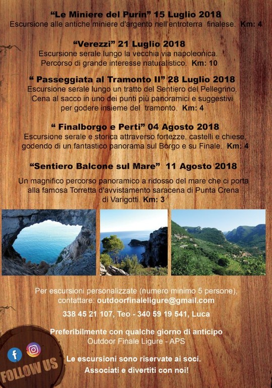 E non è finita: Riccardo, Luca e Matteo organizzano in prima persona escursioni, collaborando con guide turistiche per i borghi e con guide MTB per chi vuole fare un giro in bicicletta. Il sito è in costante rinnovamento, il calendario viene aggiornato periodicamente sia sul sito, sia sulla pagina facebook outdoorfinaleligure (che ospita anche una "community" dove si raccolgono idee e suggerimenti, non mugugni!) e le escursioni spaziano tra natura, storia e cultura: si va dai sentieri napoleonici, ai Ponti Romani, alle antiche Miniere d’argento del Melogno (suggestive, particolari e poco valorizzate), all’Arma delle Manie. Basta sottoscrivere un tesseramento annuo di 12 euro (indispensabile a termini di legge per godere della copertura assicurativa) e si apre un ventaglio di possibilità costantemente aggiornato. Si può prenotare scrivendo a outdoorfinaleligure@gmail.com. In allegato nella gallery fotografica di questo articolo si può vedere già una panoramica degli appuntamenti più a breve termine, compresa una suggestiva “passeggiata al tramonto” con cena al sacco. Spiegano gli organizzatori: “Per le escursioni mattutine non partiamo mai prestissimo, perché abbiamo molti utenti dal Basso Piemonte che spesso non riescono a essere qui in zona dalla sera prima e quindi devono avere il tempo di scendere e organizzarsi con calma”.