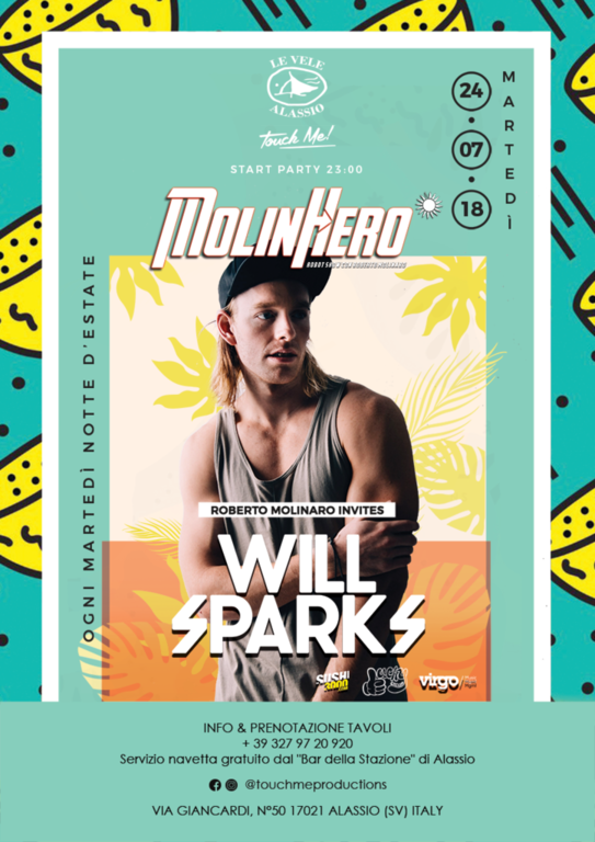Le Vele Alassio presenta Touch Me!, serata dedicata al movimento social-popolare, dai deejay che hanno fatto e continuano a fare la storia della musica in Italia fino a toccare le nuove realtà che spopolano nelle grandi arene dei festival in giro per il mondo. Questo martedì Touch Me presents MolinHero con special guest djs: Will Sparks e Roberto Molinaro. L'ingresso è in riduzione entro le ore 00:00 e ridotto tutta la notte per i possessori della Resident Card. Vi aspettiamo! LINK evento Facebook