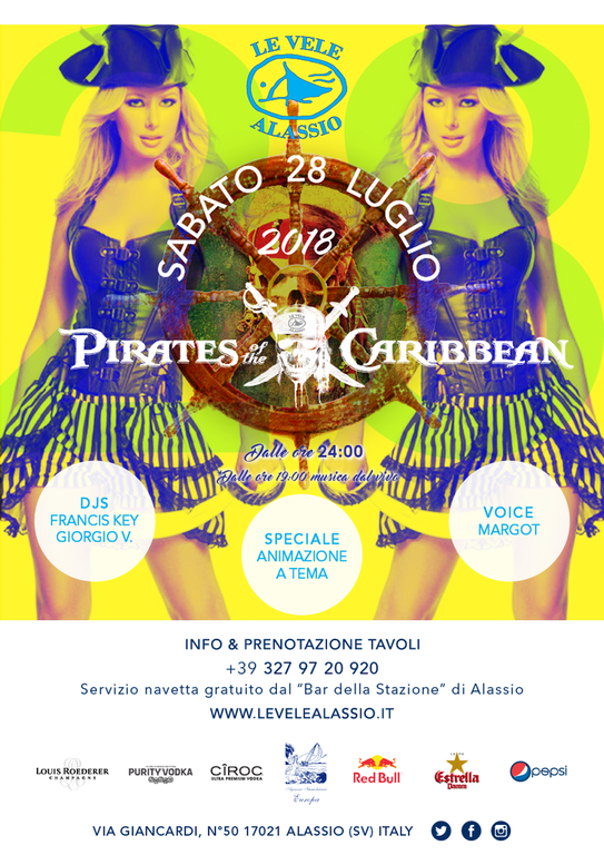 Questo sabato Le Vele Alassio presenta Il quarto di sei appuntamenti con i parties a tema della stagione estiva 2018! Immergiti nel magico scenario dei "Pirates of the Caribbean"! L'ingresso è in riduzione entro le ore 00:30 e ridotto tutta la notte per i possessori della Resident Card. Arrivate presto, fate festa insieme a noi e aspettiamo l'alba insieme! LINK evento Facebook