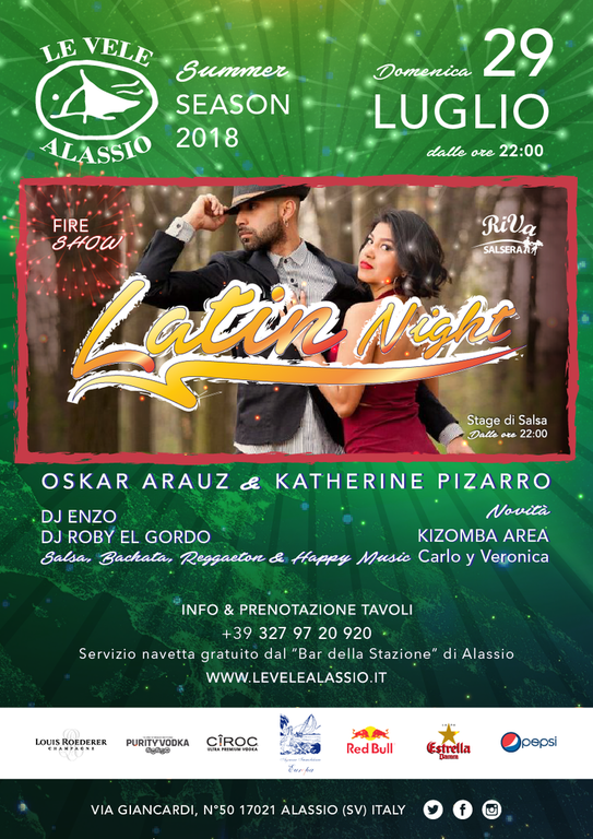 Le Vele Alassio - Latin Night by Riva Salsera, il grande ritorno a Le Vele Alassio della serata dedicata agli amanti dei balli latino-americani: Salsa e Bachata, inoltre Reggaeton e Kizomba Area! Questa domenicasiamo lieti di presentare Oskar Arauz & Katherine Pizarro. Stage di Salsa dalle ore 22:00. Vi aspettiamo! LINK evento Facebook