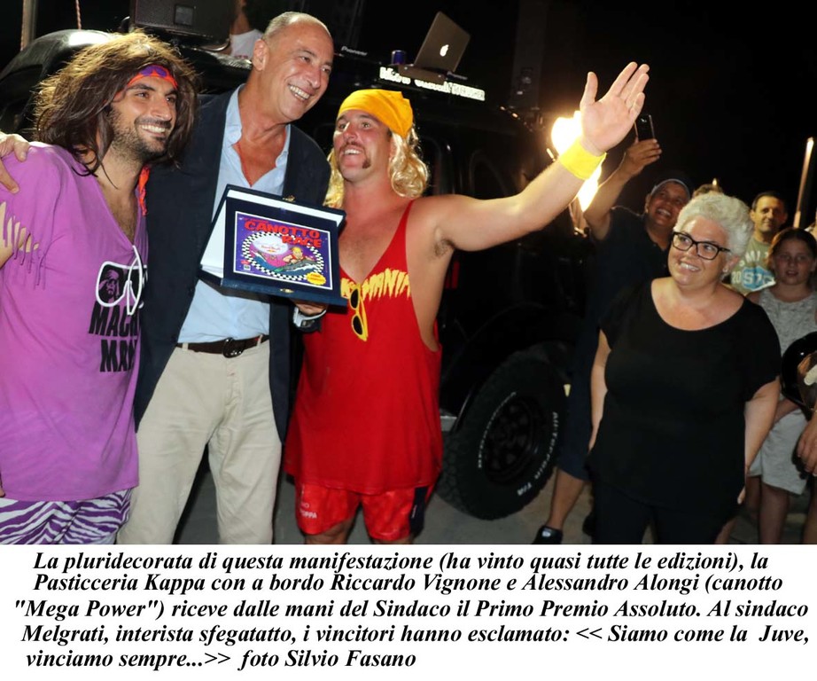 Il molo Bestoso e la spiaggia a levante antistante brulicava ieri sera di turisti spettatori e di concorrenti "nautici" della manifestazione "Canotto Race", sesta edizione. I canotti in concorso erano 19, ciascuno con un tema allegorico che raccontava goliardicamente l'attualità o la storia (come i carri di carnevale, insomma).