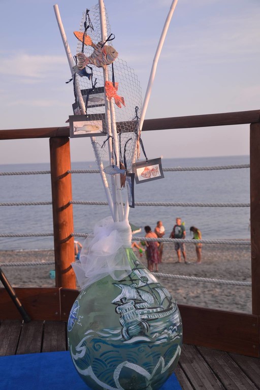 Le artiste hanno presentato, a corredo della serata, tre opere a testa, opere particolari perché hanno voluto lavorare sul concetto del mare e della sua poesia, della trasparenza e anche delle cose che dalle onde riemergono (legni, ciottoli, vetri), per cui hanno decorato sei damigiane in vetro verde, che fungevano da supporto e opera contemporaneamente, ognuna delle artiste ha espresso in autonomia la propria personalità artistica, legandosi alle opere dell'altra solo attraverso pochi elementi: il vetro, il legno, la rete e la terracotta.