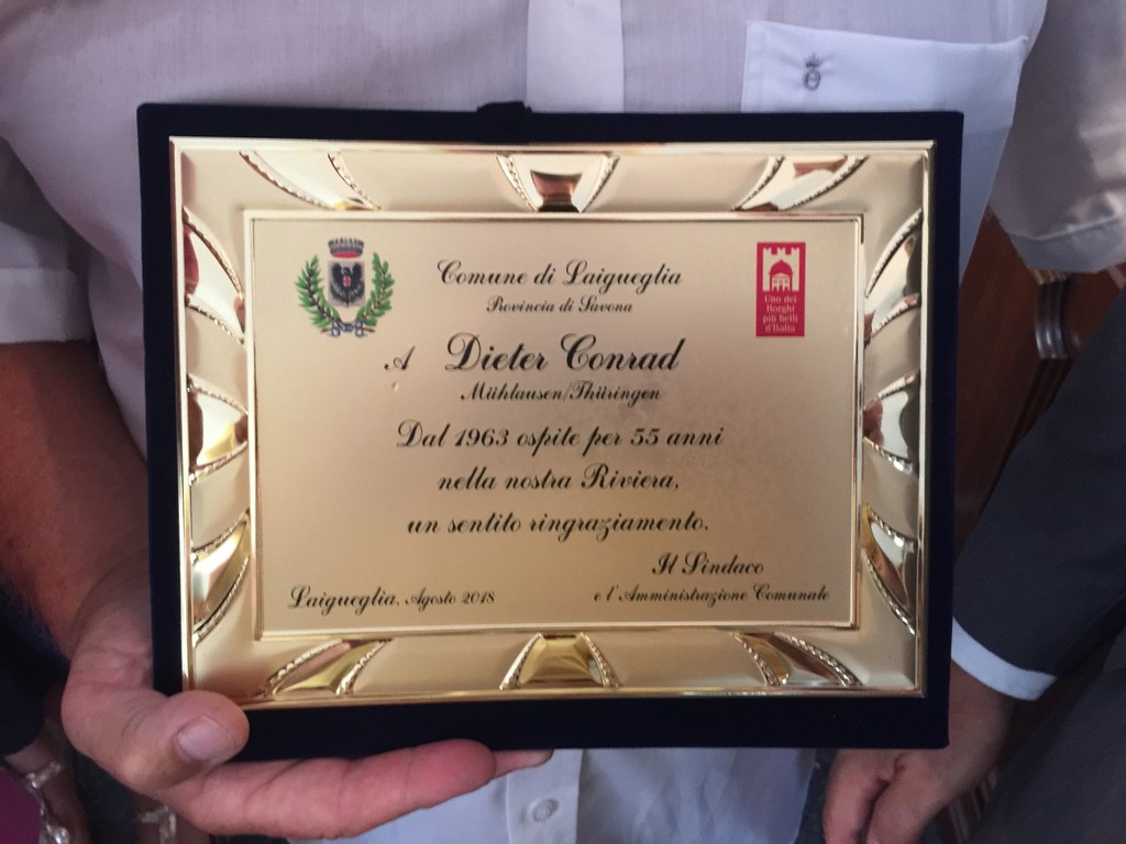 Premiato questa mattina dal Sindaco di Laigueglia Roberto Sasso Del Verme il Signor Dieter Conrad, classe 1947 originario di Mühlausen/Thüringen - Germania.