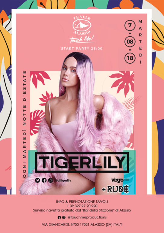 Le Vele Alassio presenta Touch Me!, serata dedicata al movimento social-popolare, dai deejay che hanno fatto e continuano a fare la storia della musica in Italia fino a toccare le nuove realtà che spopolano nelle grandi arene dei festival in giro per il mondo. Questo martedì special guest dj: Tigerlily. L'ingresso è in riduzione entro le ore 00:00 e ridotto tutta la notte per i possessori della Resident Card. Vi aspettiamo!