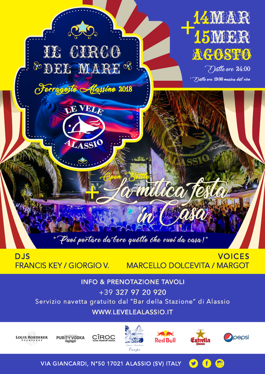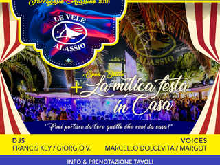 Le Vele Alassio presenta “Ferragosto Alassino 2018”! Come da tradizione vi aspettiamo per festeggiare insieme il Ferragosto in Riviera ligure di Ponente: Martedì 14 con la grande festa a tema "Il Circo del Mare" e Mercoledì 15 con la mitica "Festa in Casa"! Arrivate presto, fate festa insieme a noi e aspettiamo l'alba insieme!