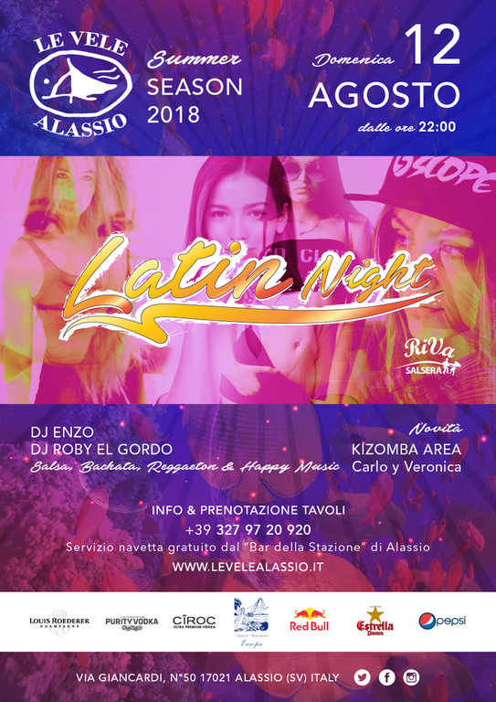Le Vele Alassio - Latin Night by Riva Salsera, l'ultima grande notte a Le Vele Alassio dedicata agli amanti dei balli latino-americani: Salsa e Bachata, inoltre Reggaeton e Kizomba Area! Vi aspettiamo!