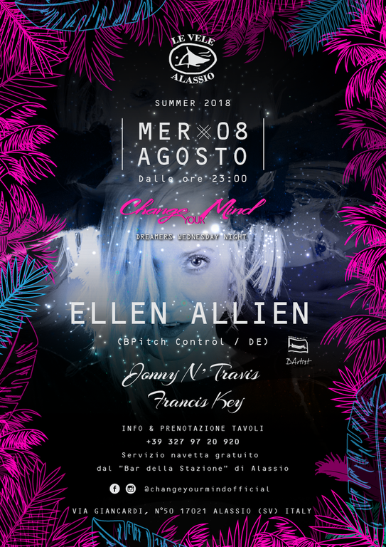 Le Vele Alassio presenta Change Your Mind, serata dedicata alla musica elettronica con ospiti di fama internazionale. Questo mercoledì special guest dj: Ellen Allien. Resident djs: Jonny N' Travis & Francis Key. L'ingresso è in riduzione entro le ore 00:30 e ridotto tutta la notte per i possessori della Resident Card. Vi aspettiamo!