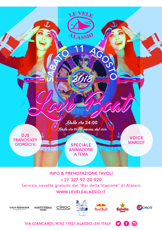 Questo sabato Le Vele Alassio presenta Il quinto di sei appuntamenti con i parties a tema della stagione estiva 2018! Immergiti nel magico scenario marinaresco del "Love Boat", sicuramente la festa più rappresentativa del mondo de Le Vele Alassio! L'ingresso è in riduzione entro le ore 00:30 e ridotto tutta la notte per i possessori della Resident Card. Arrivate presto, fate festa insieme a noi e aspettiamo l'alba insieme!