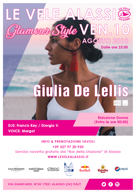 Le Vele Alassio - Glamour Style, il venerdì notte dedicato a una clientela cool & chic! Questo venerdì Le Vele Alassio sono liete di presentare Giulia De Lellis, ex concorrente del "Grande Fratello VIP" ed ex corteggiatrice di "Uomini e Donne". Attualmente è una delle "influencer" italiane più seguite e amate! L'ingresso è in riduzione per le donne entro le ore 00:00 e ridotto tutta la notte per i possessori della Resident Card! Vi aspettiamo!