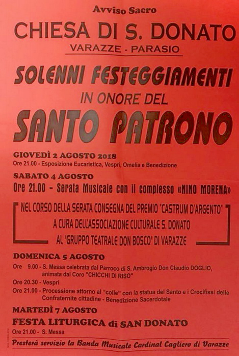 Martedì 7 agosto 2018 a Varazze, nella Chiesa di San Donato, con la S. Messa a suffragio dei benefattori defunti delle ore 20:30, si concludono i festeggiamenti in onore del Santo Patrono.
