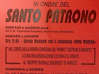 I festeggiamenti iniziati giovedì 2 agosto l’esposizione eucaristica, Vespro, Omelia e Benedizione delle ore 21:00, sono proseguiti sabato 4 agosto con la serata musicale con il complesso “Nino Morena”. Nel corso dell’intrattenimento si è tenuta la cerimonia di consegna del prestigioso Premio Castrum d’ Argento, che quest’anno è stato assegnato al Gruppo Teatrale Don Bosco, in considerazione dell’impegno e passione profusa nel campo teatrale ed in particolare per il rilancio della cultura dialettale. A consegnare il premio il Sindaco Avv. Alessandro Bozzano, presente anche l’Assessore Mariangela Calcagno.