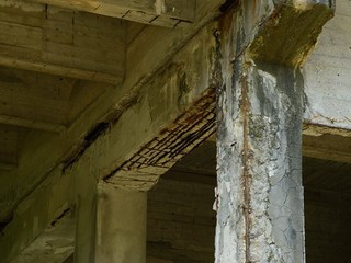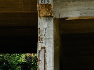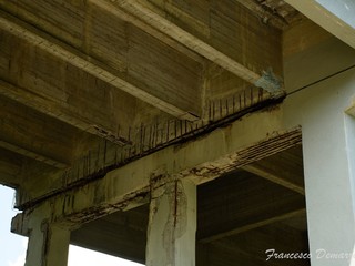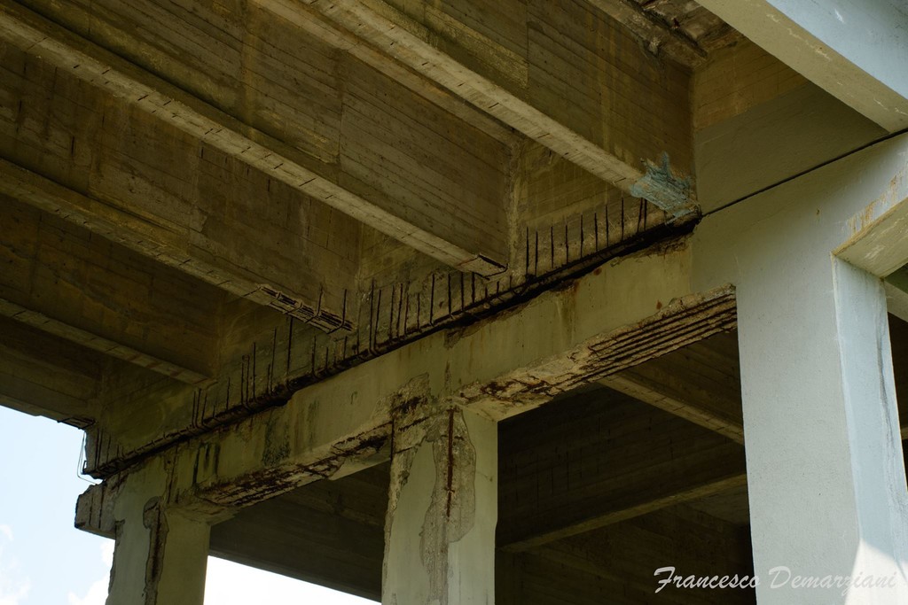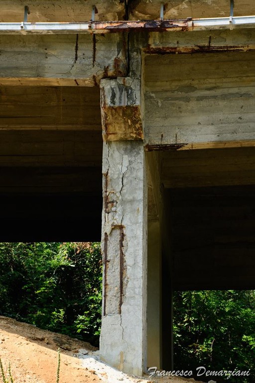 Dalle foto scattate venerdi 17 agosto 2018, si può notare lo stato di carbonatazione del cemento armato. Molti ferri di armatura sono ormai in superficie e con uno stato di corrosione avanzato. Inoltre, la sella di appoggio dell'impalcato sembrerebbe decisamente deteriorata.