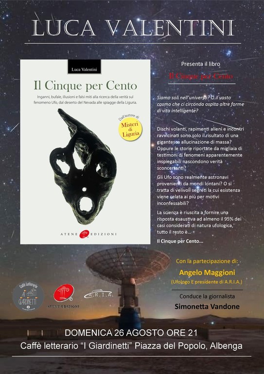 La serata, ad ingresso libero, sarà condotta dalla giornalista Simonetta Vandone, già promotrice di un importante convegno scientifico in zona, e vedrà la partecipazione dell'ufologo e presidente di A.R.I.A. (Associazione Ricerca Italiana Aliena) Angelo Maggioni che, tra gli altri, tratterà il tema degli avvistamenti Ufo in Liguria. La successiva presentazione avverrà ad Arma di Taggia, in provincia di Imperia, martedì 28 agosto dalle ore 21 in occasione della rassegna Book on the Road.